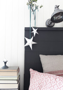 Her har vi lykter fra kolleksjonen til Halvor Bakke. Vi knytet lilla velour-bånd på og stjernenummer fra Børskompaniet. Glassene med nummer på er fra Lene Bjerre. Den blåe og hvite tråden og nummerene er fra On interiør.
